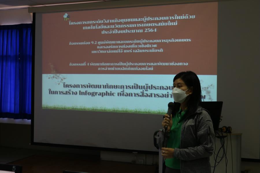 วันพุธที่ 9 กุมภาพันธ์ 2565 เวลา 9.00 น. อาจารย์ ดร.สิริยุพา เลิศกาญจนาพร รองคณบดี กล่าวเปิดโครงการยกระดับวิสาหกิจชุมชนและผู้ประกอบการใหม่ด้วยเทคโนโลยีและนวัตกรรมการเกษตรสมัยใหม่ ประจำปีงบประมาณ 2564 กิจกรรมย่อย 9.2 ศูนย์พัฒนาและยกระดับผู้ประกอบการธุรกิจเกษตร และรองรับการท่องเที่ยวเชิงนิเวศ มหาวิทยาลัยแม่โจ้ แพร่ เฉลิมพระเกียรติ กิจกรรมที่ 4 พัฒนาทักษะการเป็นผู้ประกอบการและพัฒนาช่องทางการจำหน่ายผลิตภัณฑ์ออนไลน์ ซึ่งในครั้งนี้ได้จัดโครงการพัฒนาทักษะการเป็นผู้ประกอบการในการสร้าง Infographic เพื่อการสื่อสารอย่างมืออาชีพ วิทยากรโดย อาจารย์ ดร.วัชรี เลขะวิพัฒน์ มหาวิทยาลัยแม่โจ้ - แพร่ เฉลิมพระเกียรติ มีบุคลากรภายในมหาวิทยาลัยและบุคลากรภายนอก เข้าร่วมฝึกอบรมในครั้งนี้ ณ ห้องคอมพิวเตอร์ 3 อาคารพลังแม่โจ้สามัคคี มหาวิทยาลัยแม่โจ้ - แพร่ เฉลิมพระเกียรติ