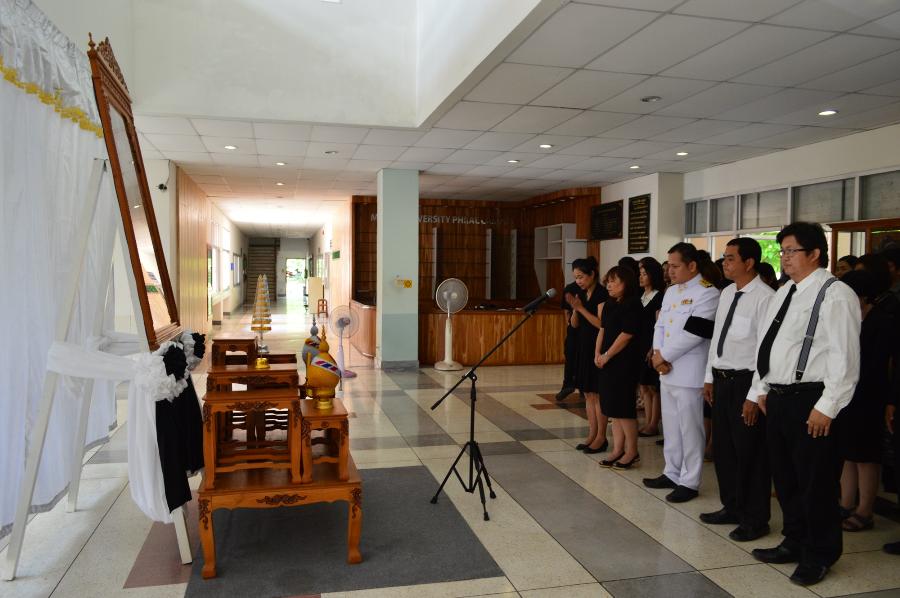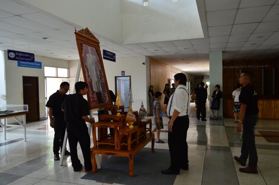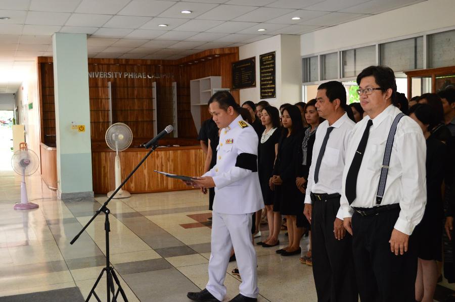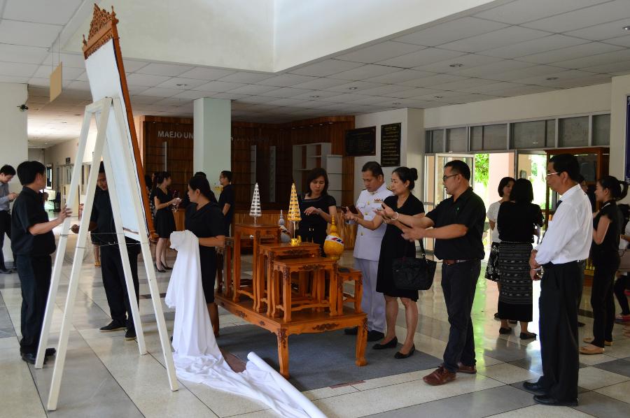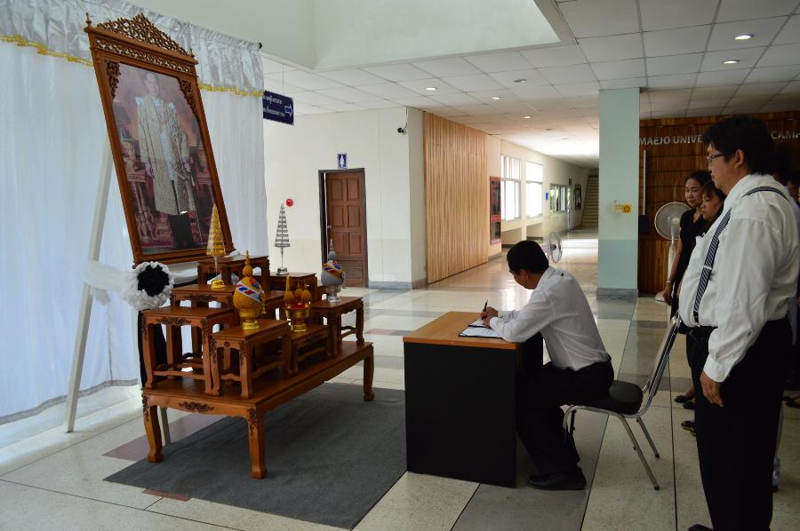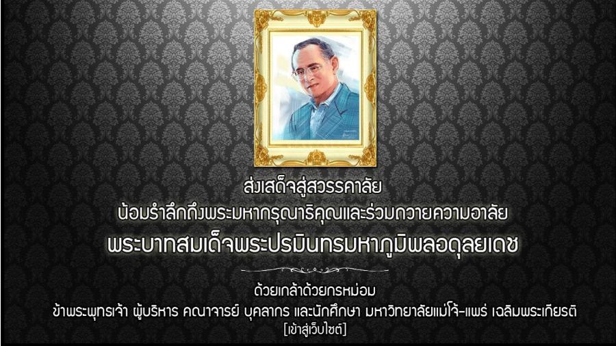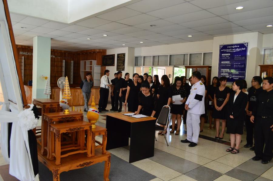 วันที่ 14 ตุลาคม 2559 เวลา 13.30 น. มหาวิทยาลัยแม่โจ้-แพร่ เฉลิมพระเกียรติ นำโดย อาจารย์ ดร.ศุกรี อยู่สุข ผู้อำนวยการมหาวิทยาลัย พร้อมด้วยผู้บริหาร คณาจารย์ และเจ้าหน้าที่ น้อมเกล้าน้อมกระหม่อมถวายอาลัย ส่งดวงพระวิญญาณพระบาทสมเด็จพระเจ้าอยู่หัวฯ ในพระบรมโกศ เสด็จสู่สวรรคาลัย ณ บริเวณโถงกลาง ชั้น 1 อาคารนำชัย ทนุผล มหาวิทยาลัยแม่โจ้-แพร่ เฉลิมพระเกียรติ