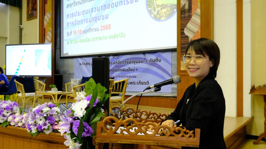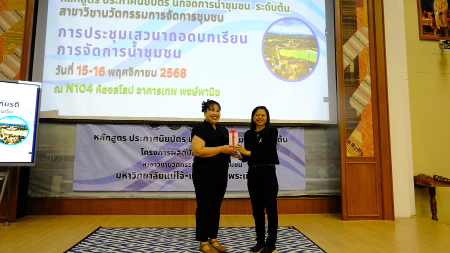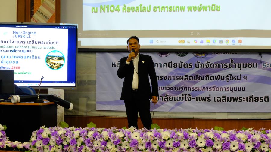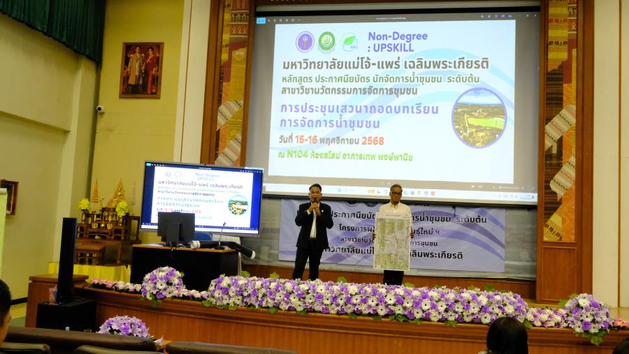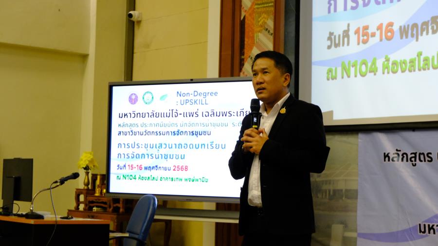 วันเสาร์ที่ 15 พฤศจิกายน 2568 ผู้ช่วยศาสตราจารย์ ดร.รัฐพงศ์ ปกแก้ว คณบดีมหาวิทยาลัยแม่โจ้-แพร่ เฉลิมพระเกียรติ กล่าวต้อนรับผู้เรียน ในการประชุมเสวนาถอดบทเรียน การจัดการน้ำชุมชน หลักสูตร ประกาศนียบัตร นักจัดการน้ำชุมชน ระดับต้น (Non degree) สาขาวิชานวัตกรรมการจัดการชุมชน ซึ่งมีเสวนา หัวข้อ “ข้อค้นพบสำคัญจาก หลักสูตรนักจัดการน้ำชุมชนระดับต้น สู่แนวคิดการบริหารจัดการน้ำโดยฐานท้องถิ่น” โดย คณาจารย์สาขาวิชานวัตกรรมการจัดการชุมชน และนำเสนอผลงานผู้เรียนในหลักสูตรฯ มีให้ข้อคิดเห็นและข้อเสนอแนะจากผู้ทรงคุณวุฒิ ดังนี้ 1. ดร.รอยบุญ รัศมีเทศ ผู้อำนวยการสถาบันสารสนเทศทรัพยากรน้ำ 2. คุณนิศากร ยิ่งขจร ผู้อำนวยการฝ่ายจัดการน้ำชุมชน 3. อาจารย์บพิตร เกตุวราภรณ์ อดีตพัฒนาการจังหวัด 4. ผู้ช่วยศาสตราจารย์ ดร.ปณิธี บุญสา มหาวิทยาลัยแม่โจ้-แพร่ เฉลิมพระเกียรติ และ 5. ผู้ช่วยศาสตราจารย์ ดร.มัชฌิมา ศุภวิมลพันธ์ มหาวิทยาลัยแม่โจ้-แพร่ เฉลิมพระเกียรติ มุ่งเน้นพัฒนาความรู้และทักษะที่จำเป็นเพื่อใช้ขับเคลื่อนการบริหารจัดการน้ำชุมชน ณ N104 ห้องสโลป อาคารเทพ พงษ์พานิช มหาวิทยาลัยแม่โจ้-แพร่ เฉลิมพระเกียรติ